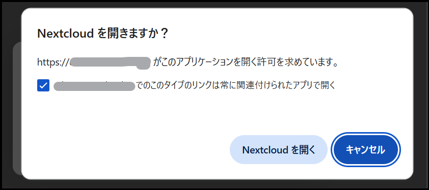 そうすると「ブラウザーダイアログ」がでますので、「Nextcloudを開く」をクリックしてください。